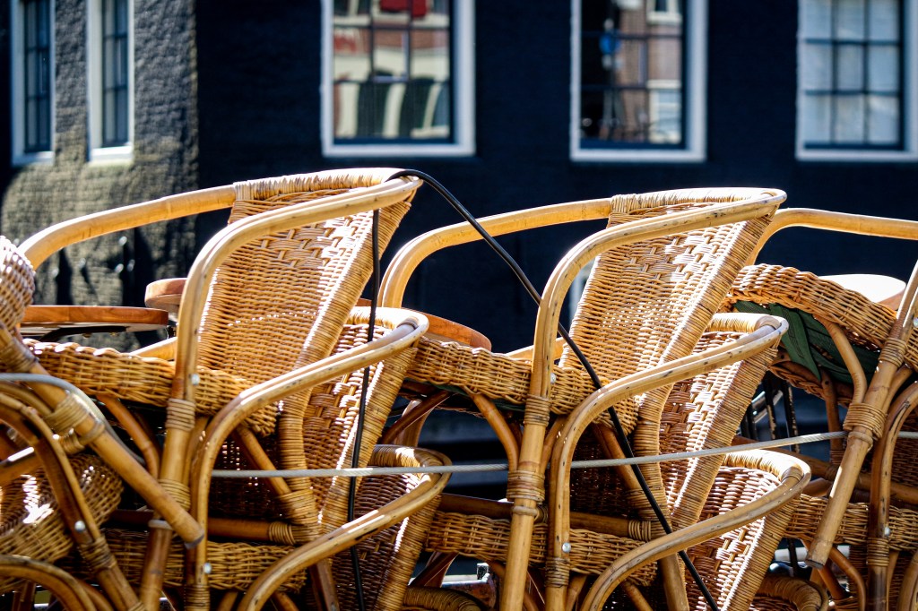 Het beeld van opgestapelde terrasstoelen en barretjes met ‘gesloten’ bordjes staat in schril contrast met de zon die fel schijnt. Even een biertje doen, zit er niet in. Ik passeer een groepje duiven die, met een uitgestorven Waterlooplein op de achtergrond, de anderhalve meter afstand aan hun teenloze stompjes lappen en lekker dicht op elkaar zitten. Nooit gedacht dat ik jaloers zou kunnen zijn op een groepje stadsduiven. Voor alles een eerste keer.