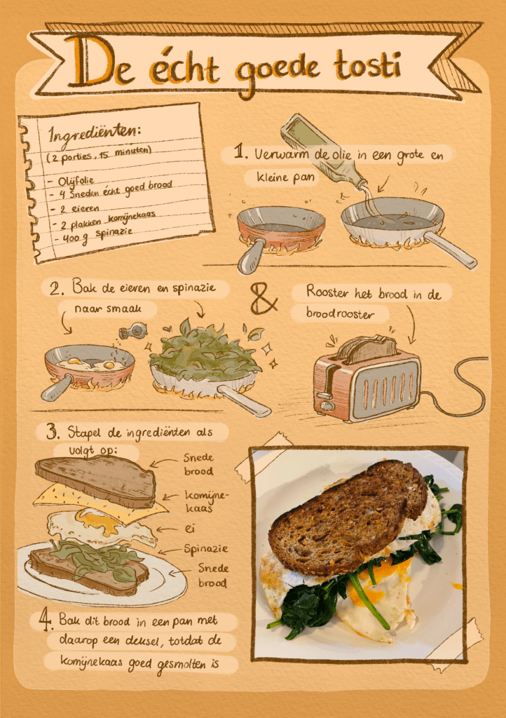 Eenmaal thuis aangekomen deden we gelijk de kookschorten aan, wasten we onze handen en legden we alle pannen en spatels klaar. We begonnen aan het tosti-avontuur door eerst de spinazie in de grote pan met hete olijfolie te leggen en een paar minuten te roeren. Toen mijn vriend nonchalant de hele zak spinazie in de pan deponeerde, schreeuwde ik verontwaardigd dat dit veel te veel spinazie was, maar tot mijn verbazing kromp het ontzettend. De spinazie was op den duur gewoon bijna verdwenen! Ondertussen bakten we twee eieren in een andere pan en roosterden we vier dikke sneden brood tot ze lekker krokant waren. Toen de spinazie, eieren en brood naar wens waren, stapelden we ze tot een broodje in de volgende volgorde: een snede ‘echt goed brood’, spinazie, ei, een plak komijnekaas en weer een snede ‘echt goed brood’. Dit bouwwerk deden we weer in de pan met de deksel erop, zodat de komijnekaas goed kon smelten. En voila: een écht goede tosti.