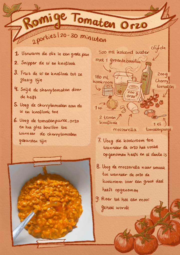 Ik was van plan om twee porties te maken, zodat ik de dag erop mijn avondeten enkel hoefde op te warmen. Hiervoor snipperde ik een ui en pureerde ik twee tenen knoflook, waarna ik deze in een grote pan met hete olijfolie deed. Ik sneed cherrytomaten door de helft en voegde deze samen met de tomatenpuree aan de ui en knoflook. Terwijl de ingrediënten bakten in de pan, goot ik de orzo erbij, waarbij je de korrels ritmisch tegen de pan hoorde kletteren. Ondertussen had ik een glas kokend water klaar staan waar ik de groentebouillon aan toevoegde, zodat de orzo zich ermee vol kon zuigen. Er ontstond een soort papje in de pan, en dus vond ik het tijd om de kookroom erbij te gieten. De Instagram Reel had de hoeveelheden van de ingrediënten niet meegegeven, wat betekende dat ik het koken puur op gevoel moest doen. Ik vond dit eng: want wat moest ik doen als dit orzomaal een soep werd, doordat ik te veel room had toegevoegd? Alles verliep gelukkig goed, en na wat roeren had ik genoeg moed verzameld om ook plakjes mozarella naar smaak toe te voegen. Wederom was er na het roeren een soort papje ontstaan, maar dan wel een ontzettend lekker papje.