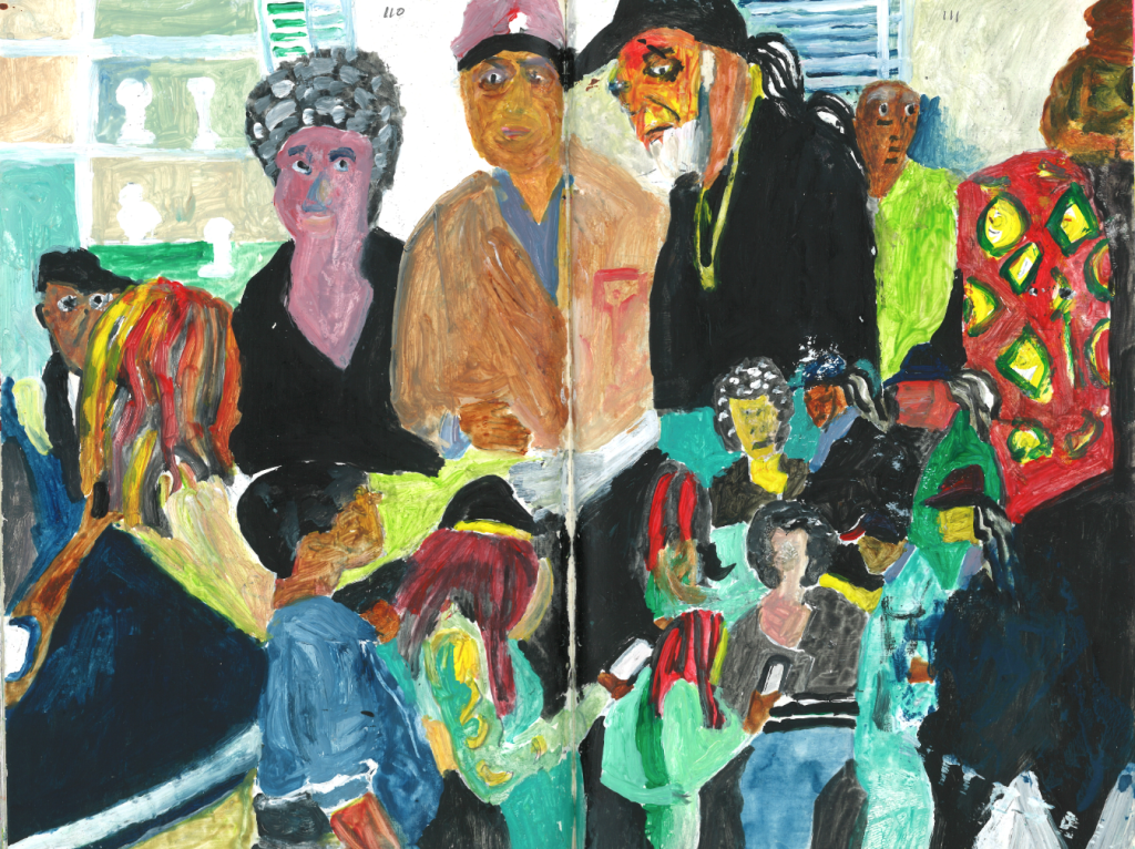 In 2016 begon ik echt. Toen ik 60 was. Ik stopte met werken en zat thuis. Ik had een burn-out en ik was niks aan het doen. Maandenlang kwam ik niet toe aan mijn werk, ik begaf me vaak in cafés of bij vrienden thuis. En toen dacht ik terug aan wat ik vroeger leuk vond om te doen: schilderen. Ik begon buiten, op straat en in cafés. Tijdens mijn burn-out was alles zwart-wit. Door te tekenen begon ik langzaam weer kleur te zien. Op een gegeven moment kwamen mensen naar mij toe met het compliment dat mijn dochter goed kon tekenen. ‘Mooie kindertekeningen, je dochter heeft talent,’ zeiden ze. Ik kreeg een klap in mijn maag, ook al was het niet lullig bedoeld. Ik durfde toen niet meer toe te geven dat het mijn eigen tekeningen waren. ‘Dankjewel,’ reageerde ik dan. Dit zijn de eerste tekeningen die je in het boek terug kunt vinden.